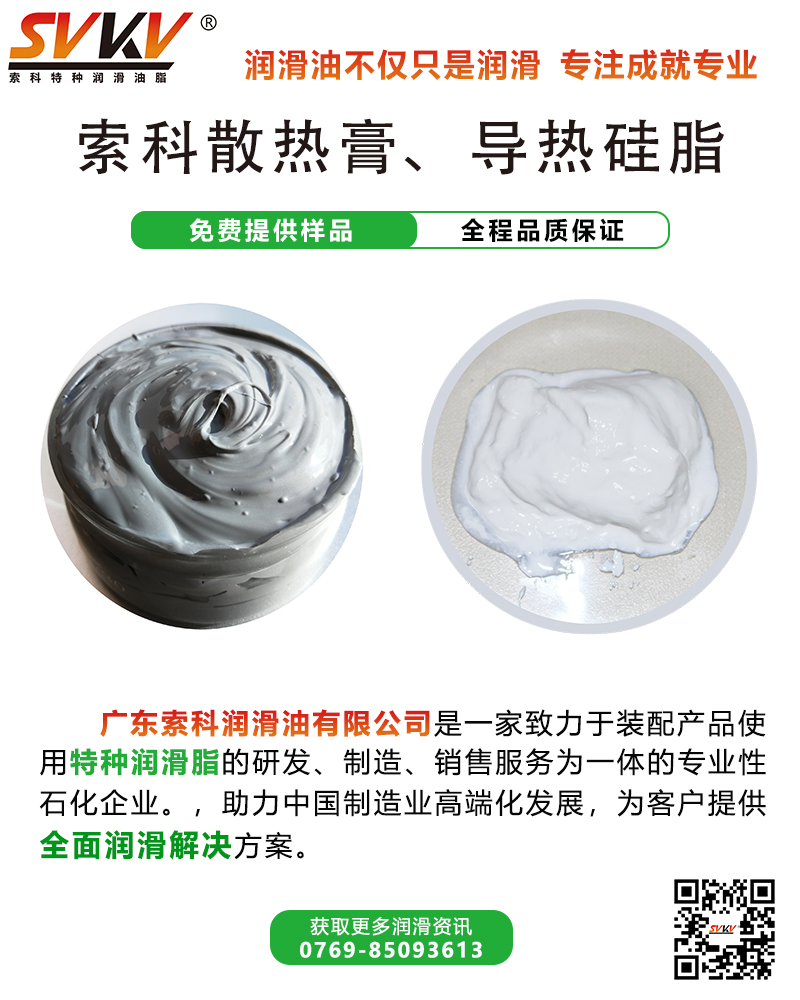 SVKV索科系列導熱硅脂以聚硅氧烷為基礎輔以高導熱填料精制而成,安全環(huán)保,性能穩(wěn)定,既具有優(yōu)異的電絕緣性,又具有優(yōu)異的導熱性,揮發(fā)性小,可薄膜涂覆。